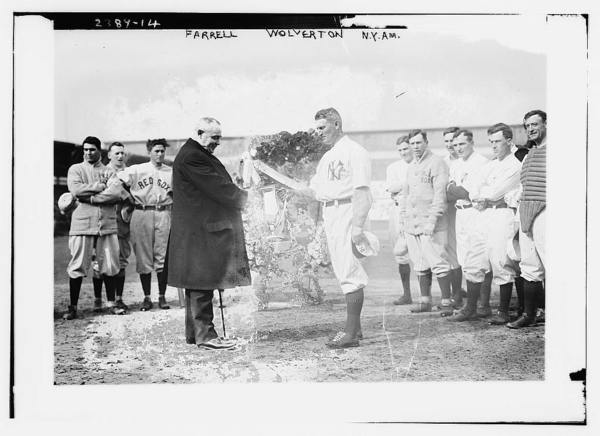 New York Yankees president Frank Farrell presents loving cup to Yankees manager Harry Wolverton as Red Sox and Yankees players look on at Hilltop park, New York, April 11, 1912 (baseball)