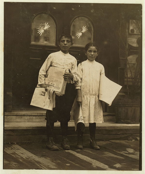 Newsgirl & Boy Selling around saloon entrances. Bowery. Location: New York, New York (State)