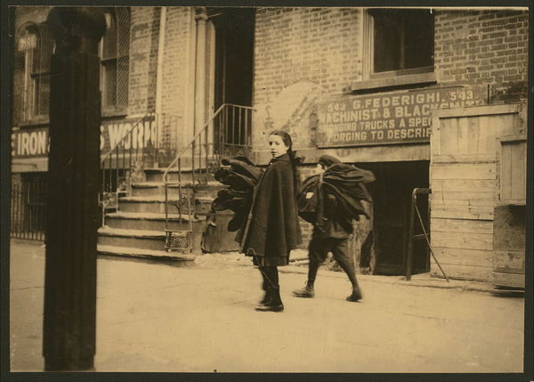 Nine and twelve-year-old children carrying coats home to be finished. Thompson St., N.Y. Location: New York, New York (State)