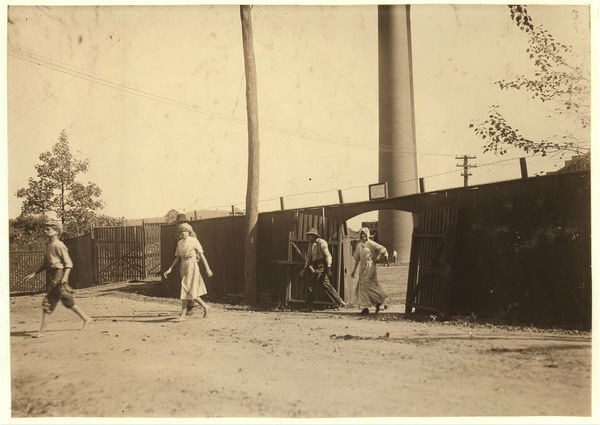 Some of the youngsters in the Scotland Neck Cotton Mill going home to dinner. This mill has a number of children. One boy told me 10 years old, and one 7. Location: Scotland Neck, North Carolina.