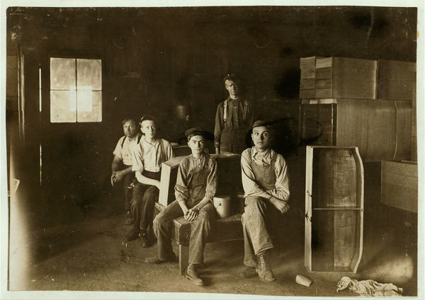 Noon Hour in an Indianapolis Furniture Factory. Aug., 1908. Wit., E. N. Clopper. Location: Indianapolis, Indiana.