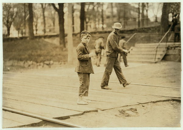 Noon Hour, May 19, 1909. Small boy is William Le Bruex, 81 Main St. Has been working in Great Falls Mfg. Co., Somersworth, N.H. for 9 months. Location: Somersworth, New Hampshire.