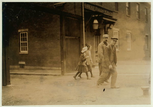 Noon Hour, May 19, 1909. Small boy is William Le Bruex, 81 Main St. Has been working in Great Falls Mfg. Co., Somersworth, N.H. for 9 months. Location: Somersworth, New Hampshire.