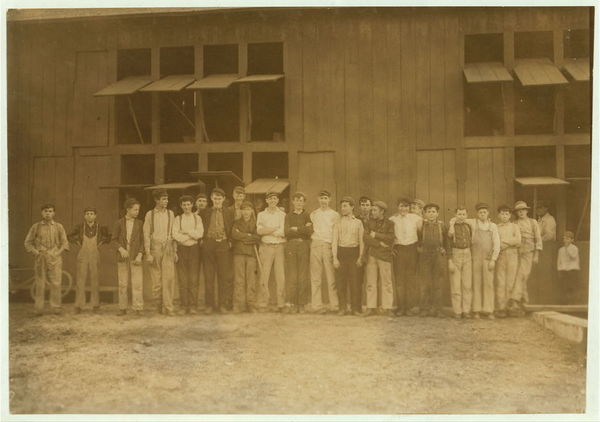Noon hour, Milleville i.e., Millville? Bottle Works, N.J. All work there, except tiny boy on end. Location: Millville, New Jersey.