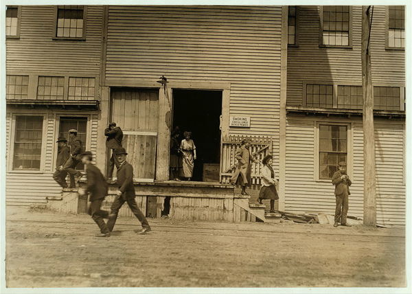 Noon hour, Sanford Mfg. Co., Sanford, Me. Some young boys and girls employed here. Location: Sanford, Maine.