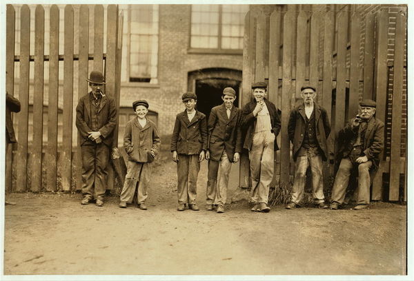 Noon, June 10, 1909. Parker Mills, Warren, R.I. All these and about a dozen more I saw working in this mill that A.M. when I visited the mill. The smallest boy in middle has been working there 3 years. Location: Warren, Rhode Island.
