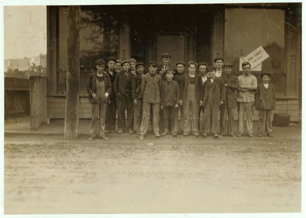 Noon, June 10, 1909. Parker Mills, Warren, R.I. All these and about a dozen more I saw working in this mill that A.M. when I visited the mill. The smallest boy in middle has been working there 3 years. Location: Warren, Rhode Island.