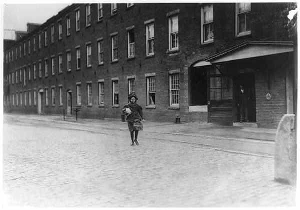 Noon, Saturday, May 22, 1909. One of the many young girls who are working in Amoskeag Mills, Manchester, N.H. I saw them (and many others smaller) working at the spinning frames. Location: Manchester, New Hampshire.