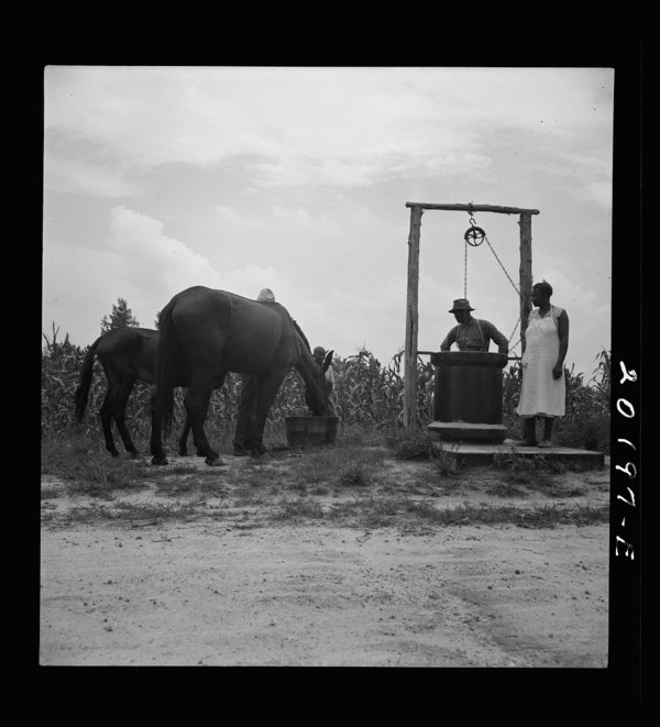 Noontime chores. Mules are brought in from the field and watered at well across the road from the house. Granville County, North Carolina