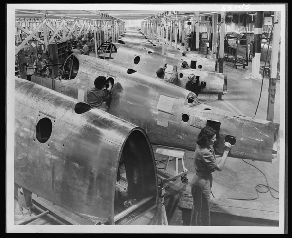 Castings for the landing gear of a North American P-51 are machined on this huge mill