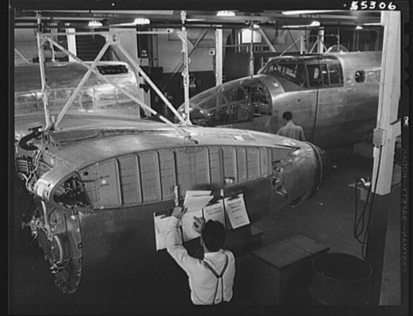 North American B-25 bomber fuselage sections move down a long overhead powered conveyor line