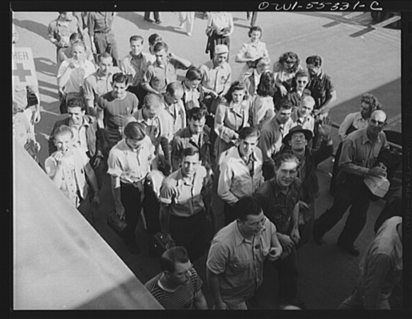 A vairety of programs are presented to North American employees during their lunch period. Here thousands watch a boxing match between two employees