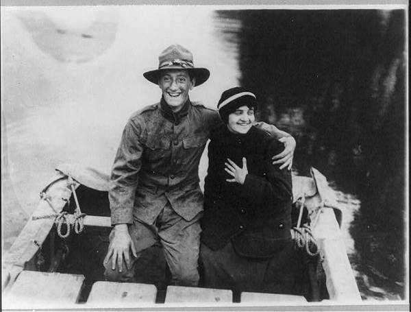 N.Y. National Guard training and maneuvers at Fishkill and Peekskill, N.Y.: Soldier with arm around girl in bow of boat