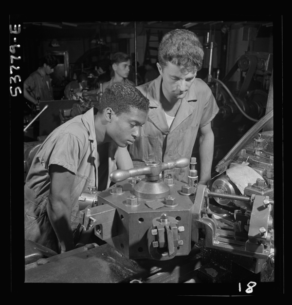 NYA (National Youth Administration) work center, Brooklyn, New York. Two turret-lathe workers, Negro and white, who are receiving training in machine shop practice, watching a cutting-off operation on a turret lathe