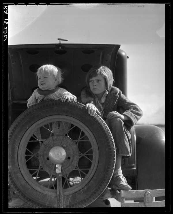 Drought refugees. Penniless Oklahomans camped along highway. Came seven months ago. "Can't make it. Want to go back. Ate up our car. Ate up our tent. Living like hogs." California