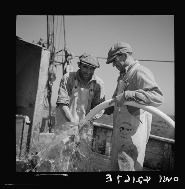 On board a fishing vessel, out from Gloucester, Massachusetts. Fishermen on the deck, washing up with a hose