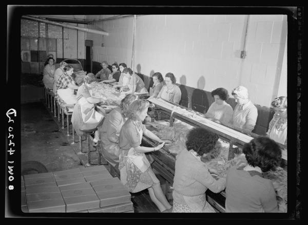 On board a fishing vessel out from Gloucester, Massachusetts. Women in a packing plant candling fish and cutting out a parasite known as Syphirin lumpii
