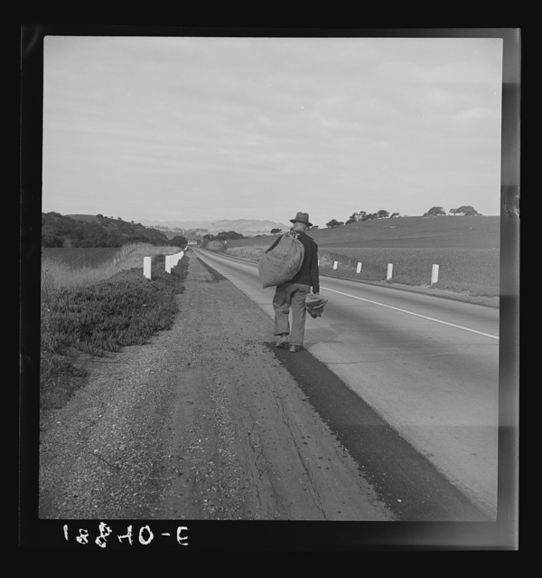 On U.S. 101 near San Luis Obispo, California. Itinerant worker. Not the old "Bindle-Stiff" type