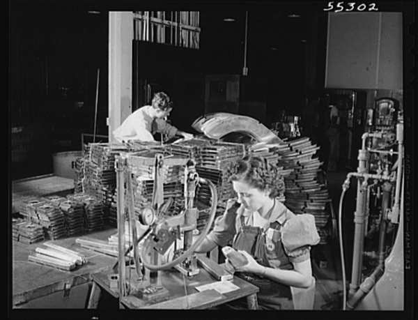 One of North American's women employees operates a pneumatic numbering machine in the sheet metal department. All items are given index numbers
