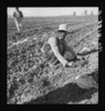 One of a Mexican gang of migratory laborers thinning and weeding cantaloupe plants at thirty cents an hour; the young plants are capped with wax paper spread over a wire wicket to protect against cold and accelerate growth. Imperial Valley, California