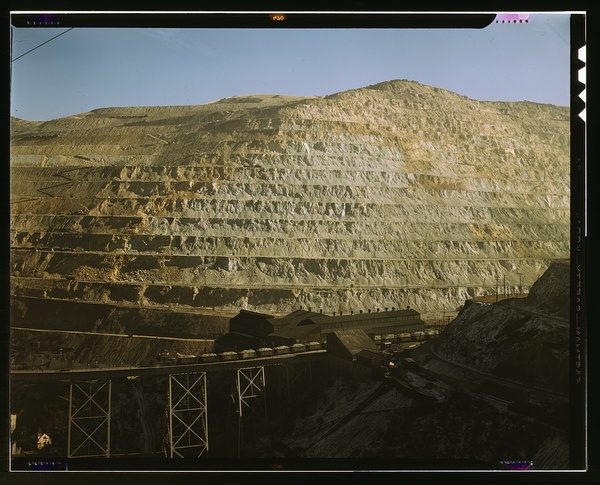 Open-pit workings of the Utah Copper Company, Bingham Canyon, Utah. This is the Carr Fork side from which the company obtains huge amounts of ore. The Carr Fork bridge and main shops appear in the foreground