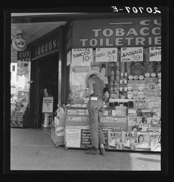 Oregon. Medford. Half-grown farm boy on main drugstore corner in town
