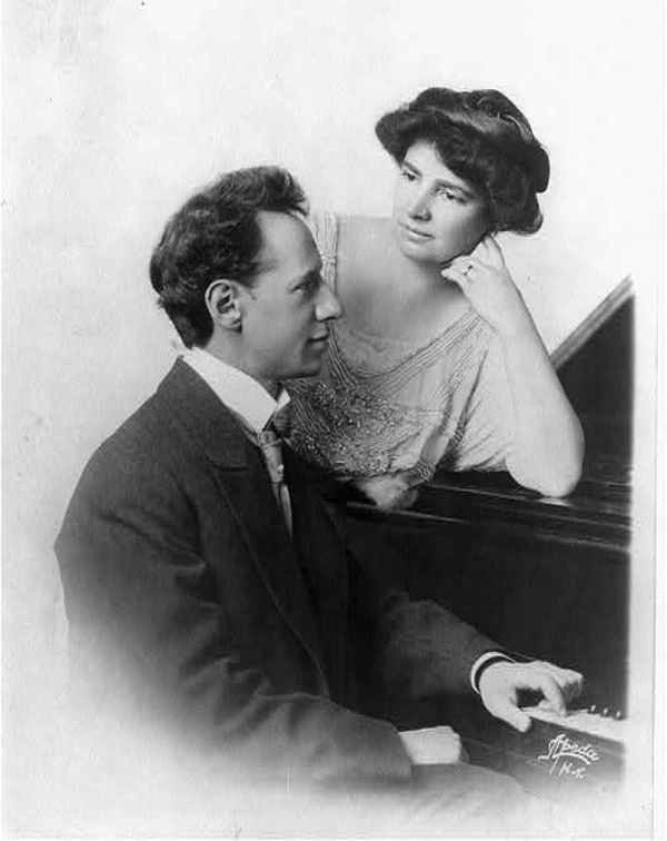 Ossip Gabrilowitsch, 1878-1936, half-length portrait, seated at piano, right profile, with wife Clara Clemens