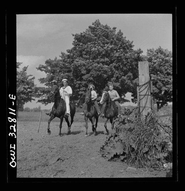 Oswego, New York. Belgian sailor riding a horse with the farmer's son and daughter on the farm visited by the United Nations heroes during United Nations week