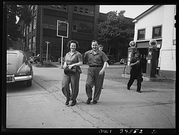 Oswego, New York. Factory workers going home at 4 p.m.