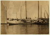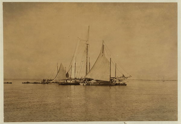 Oyster boats loading the barge. The Reef. Location: Mobile Bay, Alabama.