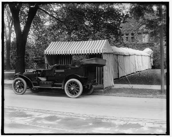 Packard automobile and tented entrance to club or dwelling, Mich.