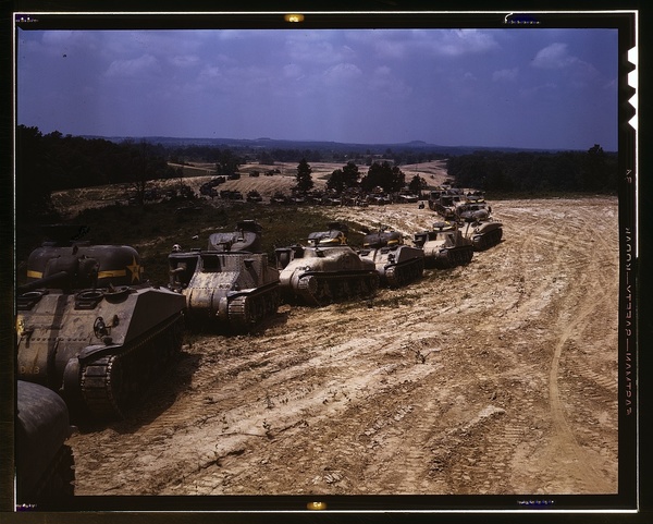 Parade of M-4 (General Sherman) and M-3 (General Grant) tanks in training maneuvers, Ft. Knox, Ky. Note the lower design of the M-4, the larger gun in the turret and the two hatches in front of the turret