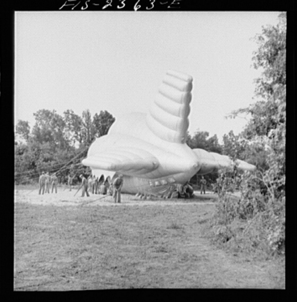 Parris Island, South Carolina. Special United States Marine units in training bedding down a big barrage balloon