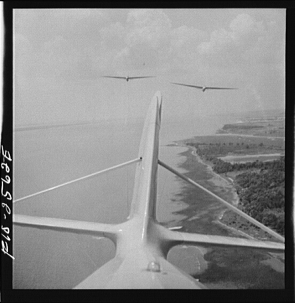Parris Island, South Carolina. U.S. Marine Corps glider detachment training camp. An aerial "tug boat" tows three gliders high above the field