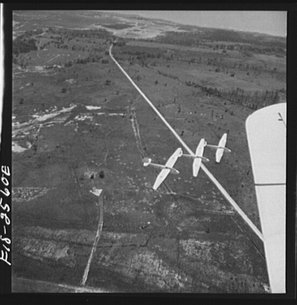Parris Island, South Carolina. U.S. Marine Corps glider detachment training camp. An aerial "tug boat" tows three gliders high above the field