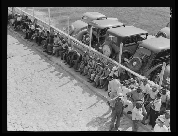 Colored laborers in Memphis, waiting at daylight in hopes of being transported to a cotton plantation for cotton chopping. Memphis, Tennessee