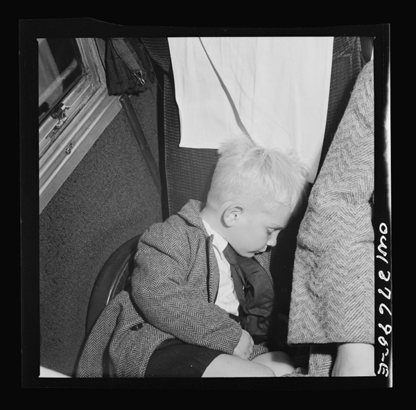 Chicago, Illinois. Passengers, homeward bound from vacations, comparing postcards and souvenirs while they wait for the bus