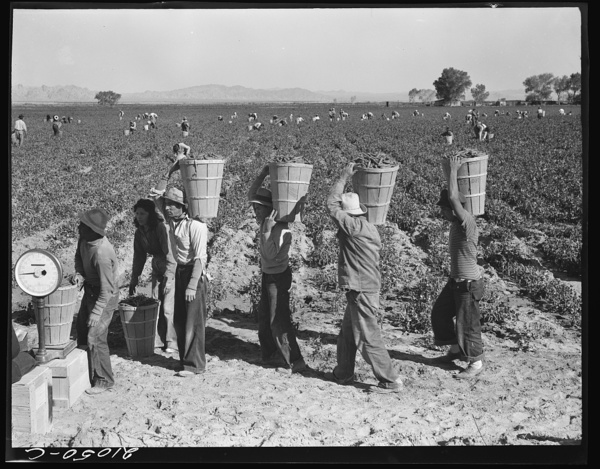 Pea pickers line up on edge of field at weigh scale. Near Calipatria, Imperial County, California