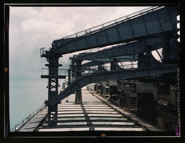 Pennsylvania R.R. ore docks, unloading iron ore from a lake freighter by means of "Hulett" unloaders, Cleveland, Ohio