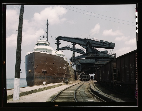 Pennsylvania R.R. ore docks, unloading ore from a lake freighter by means of "Hulett" unloaders, Cleveland, Ohio