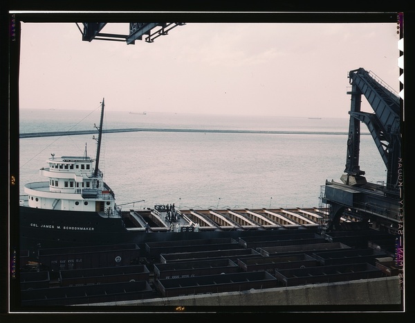 Pennsylvania R.R. ore docks, unloading iron ore from a lake freighter by means of "Hulett" unloaders, Cleveland, Ohio