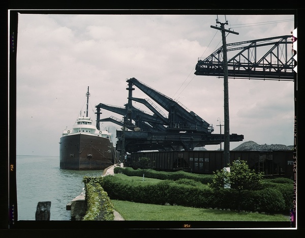 Pennsylvania R.R. Railroad ore docks, unloading iron ore from a lake freighter by means of "Hulett" unloaders, Cleveland, Ohio