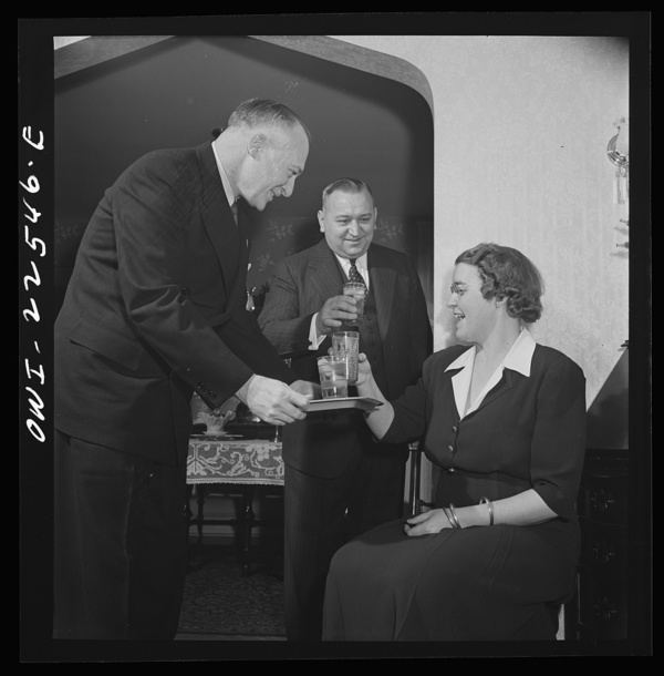 Philadelphia, Pennsylvania. Swedish-American executive of the SKF roller bearing factory serving drinks to his wife and a friend