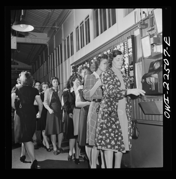 Philadelphia, Pennsylvania. Workers punching the clock at the SKF roller bearing factory