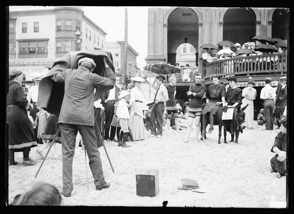 Photographer taking picture of group with donkey at crowded beach, Atlantic City, N.J.