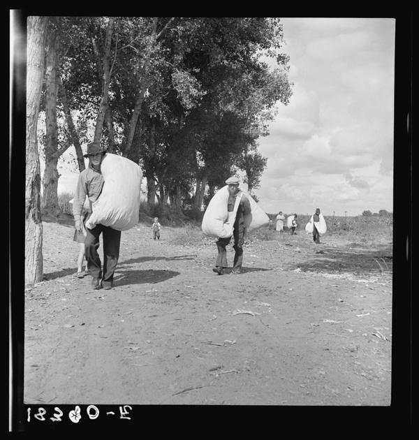 Pickers leaving the cotton field at noontime. Small cotton farm, Kern County, California