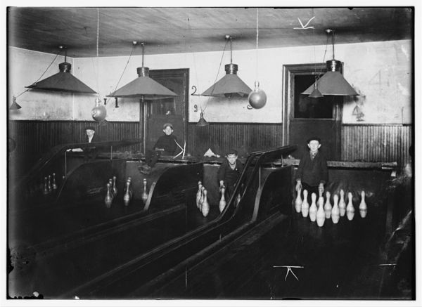 Pin-boys in a Pittsburgh Bowling Alley. They work until late at night. Location: Pittsburgh, Pennsylvania.