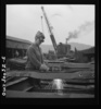 Pitcairn, Pennsylvania. Miss Helen Gusmerotti, twenty-nine, employed at the Pennsylvania Railroad as a car repairmen's helper, earning seventy-two cents per hour. Miss Gusmerotti is burning holes in the hopper car sides. She was formerly a waitress