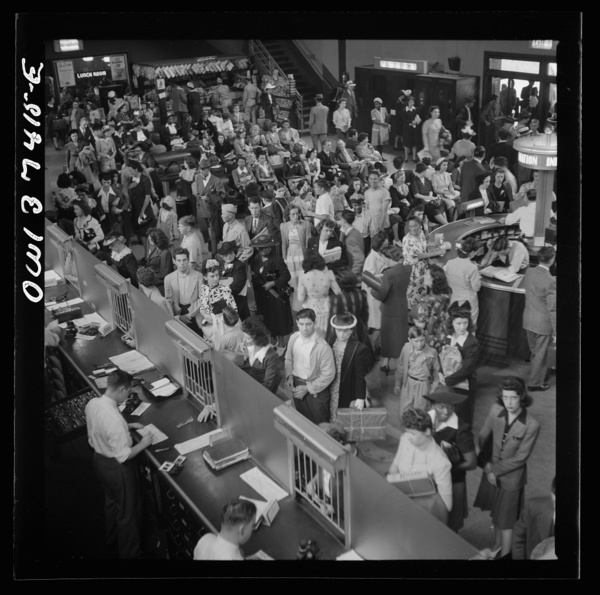 Pittsburgh, Pennsylvania. A crowd buying tickets at the Greyhound bus terminal