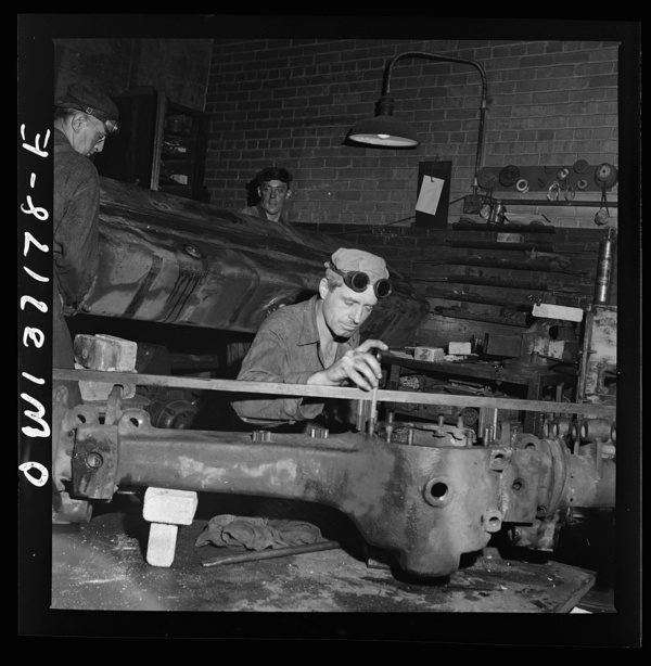 Pittsburgh, Pennsylvania. A mechanic working on a rear axle housing at the Greyhound garage